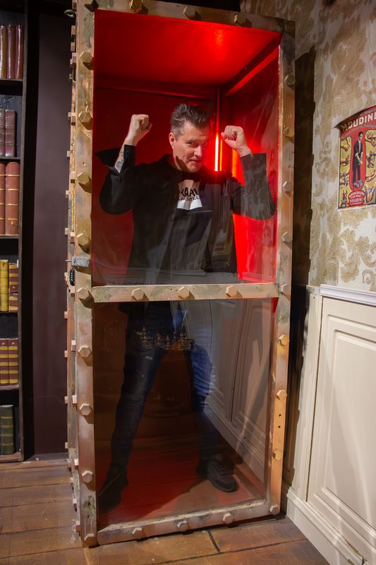 “Ik denk dat iedere illusionist een fascinatie heeft met de legendarische Harry Houdini. Hij is eigenlijk de grondlegger van het moderne entertainment. Misschien is hij zelfs wel de grondlegger van social media. Als Houdini in een restaurant aan het eten was en er aan de overkant een ongeluk gebeurde, sprong hij op, ging hij erbij staan en redde hij iemand uit een trein, maakte daar een foto mee. Alle kranten stonden er dan vol mee. Toen had je alleen nog maar kranten. Houdini redt mensen! Hij was altijd heel dicht bij de mensen en dus een soort eerste superheld.