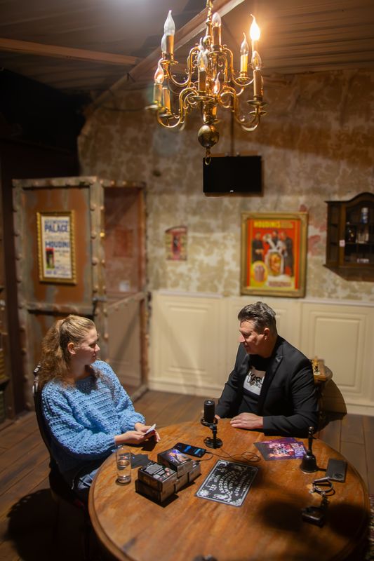 “Je bent nu eigenlijk een beetje in the House of Farla. Beneden heb ik een grote hal waar al mijn illusie-acts staan. Daar bedenken we ook dingen. De illusies voor de Houdini-tour worden daar ook getest, net als de ontsnappingen. Je moet echt trainen om uit die sloten te komen, want als er een klein stukje af is van de lockpick, krijg je het slot gewoon niet open. Als je in House of Farla bent, heerst er altijd leuke en vrolijke magie. We hebben het altijd naar ons zin en we hebben een leuk team van mensen. We hebben hier ook een kleine game-hal, dus het is echt een soort spelletjesfabriek.”